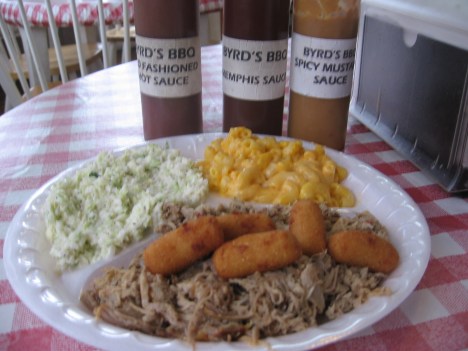 If you choose to ignore the propane tank that looms behind the building (which, of course, you should not), Byrd’s has the look of a gem of a BBQ joint. Located just outside the city limits, it occupies a rural setting that is appropriate to good ‘cue. The modest wood frame building looks the part too. And the parking lot welcomed a steady stream of pickup trucks, plumbing/electrician vans and utility company vehicles, all good signs. Even the method of ordering–open the front door and walk through the porch-like dining room that is separated by a storm door from the counter where you place your order–is encouragingly odd. The knotty pine floor, red-checked tablecloths, ceiling fans and potted plants complete the look. But looks can be deceiving, despite Byrd’s displaying most of the superficial signs one looks for in a BBQ joint.