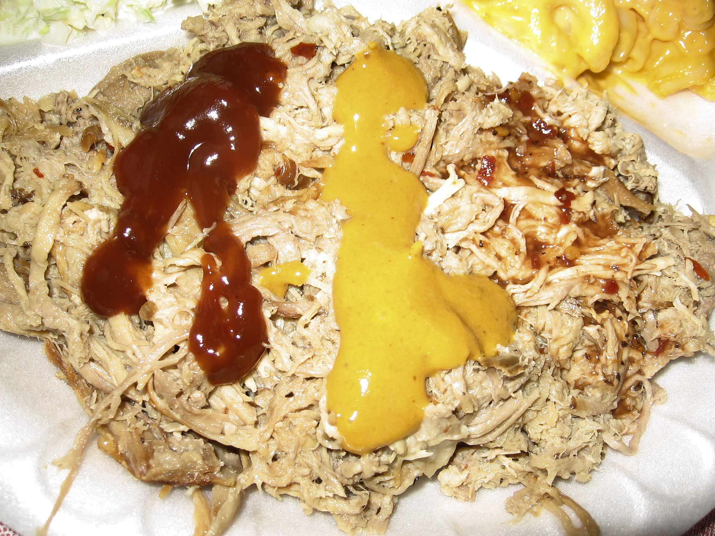 Flavor can be added from three different types of sauce available on the table (picture inset). The “Old Fashioned Hot Sauce” was actually a fairly traditional Lexington-style dip made mostly of vinegar and peppers but with a hint of tomato. It is quite good. The “Memphis Sauce” was a thick, Kraft/KC Masterpiece-style sauce–not bad but sacrilege when used on NC-style barbecue. The “Spicy Mustard Sauce” is South Carolina-inspired, though thicker and heavier on the mustard (and lighter on the vinegar) than most real SC barbecue I’ve sampled.