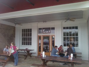 In addition to offering better than average food, the Hillsborough BBQ Company offers one of the more enjoyable barbecue dining settings in the state. The joint occupies a modest sized storefront adjacent to the old textile mill complex just a few blocks west of Churton Street on the edge of Hillsborough’s historic district. The inside features wood floors, a sturdy wood bar, and ceiling fans, while four large picnic tables offer a patio dining experience and a good view of the stained glass pig that stands guard above the front door.