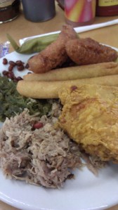 Side dishes I sampled included collards, fried yams, dirty rice, mystery greens of some sort, and cornbread. I also tried the banana pudding and peach cobbler from the dessert bar. Only the yams impressed me, while the other dishes were standard buffet fair–adequate but not memorable. That said, I don’t mean to bash Carolina BBQ. They deliver about what one would expect, which is a wide range of southern food at a fair price ($6.99 at lunch). I would not include it on my list of places to introduce someone to authentic North Carolina barbecue, but it is what it is and I can appreciate that.