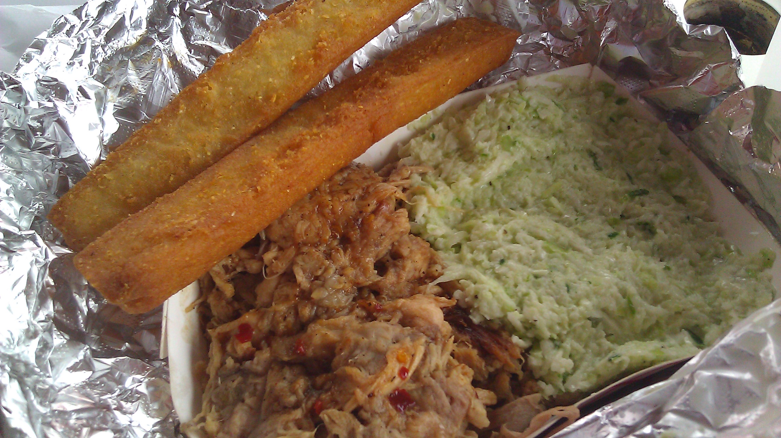 But back to the North Carolina Holy Trinity. I’d be happy to look right past the side attractions of brisket, et al. if the North Carolina barbecue was good. It wasn’t. The pork was tender, certainly, but was also sauced to the point of being downright damp, and there was little of the variation in texture between outside brown and tender inside that distinguishes some of the best barbecue. Roadside or not, this was middle of the road pig. The slaw was passable, a bit too finely chopped and too sweet for my palate, and the corn stick was typically tasty.